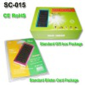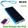 Portable Solar charger solar universal charger,solar charger like for iPod shape1) Product size : 9.2 x 4.5cm2) Battery capacity : 1350 mah3) Available color :Silver/blue/red/black4) Accessories : charge cable, USB cable, 4pcs mobile adaptor Nokia, Moto , Samsung, Sonyericsson , specification book .
